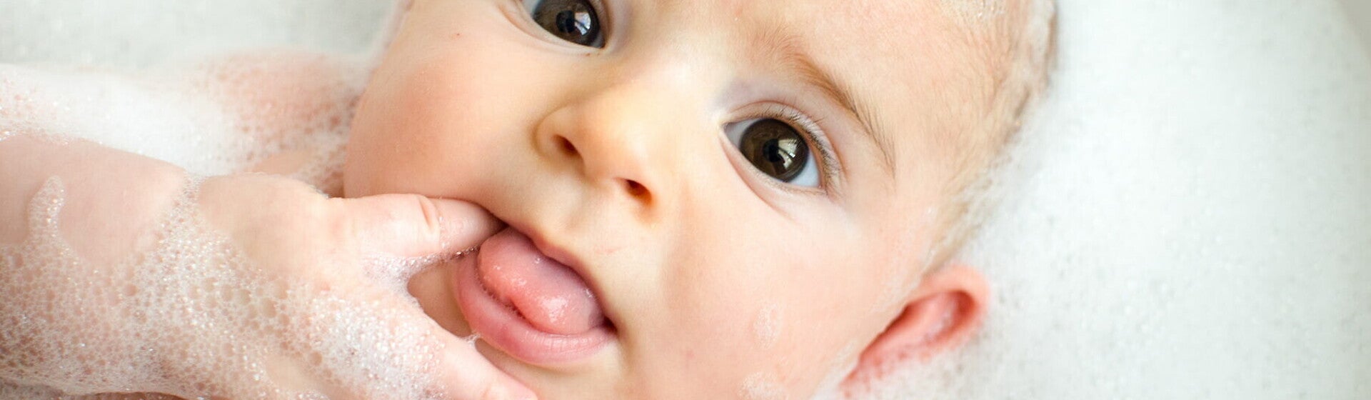 เนื่องจากจะทำให้ผิวบอบบางของทารกระคายเคือง ควรใช้มืออาบน้ำ ล้างคราบไคลอย่างเบามือ