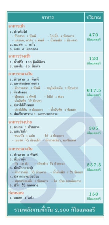 พลังงาน หญิงตั้งครรภ์ต้องการพลังงาน เพิ่มขึ้นจากเดิมประมาณ 300 กิโลแคลอรี่ต่อวัน โดยจะได้รับพลังงานรวม ประมาณ 2,000-2,300 กิโลแคลอรี่ต่อวัน คุณแม่สามารถดูตัวอย่างตารางอาหารในหนึ่งวันสำหรับคนท้องได้ดังตารางข้างล่างค่ะ