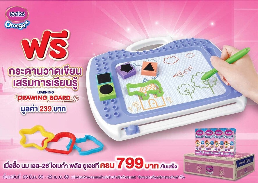 🎉 ฟรี! กระดานวาดเขียนเสริมการเรียนรู้ มูลค่า 239 บาท 🛒 เมื่อซื้อผลิตภัณฑ์นม เอส-26 โอเมก้าพลัส ยูเอชที ขนาดใดก็ได้ ที่ร้านค้าที่ร่วมรายการ ครบ 799 บาท/ใบเสร็จ 💳✨